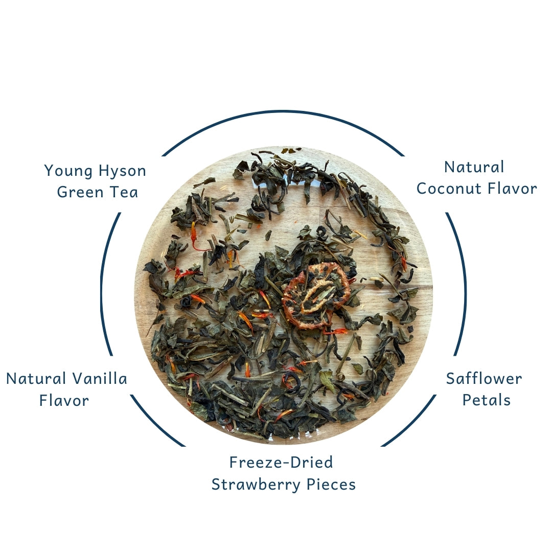 Ingredients: Young Hyson Green Tea, All Natural Flavors, Freeze-Dried Strawberry Pieces, Safflower petals.